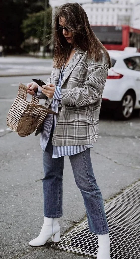 Pair an oversized blazer with a pair of wide or barrel jeans and sneakers. Add a scarf for warmth.