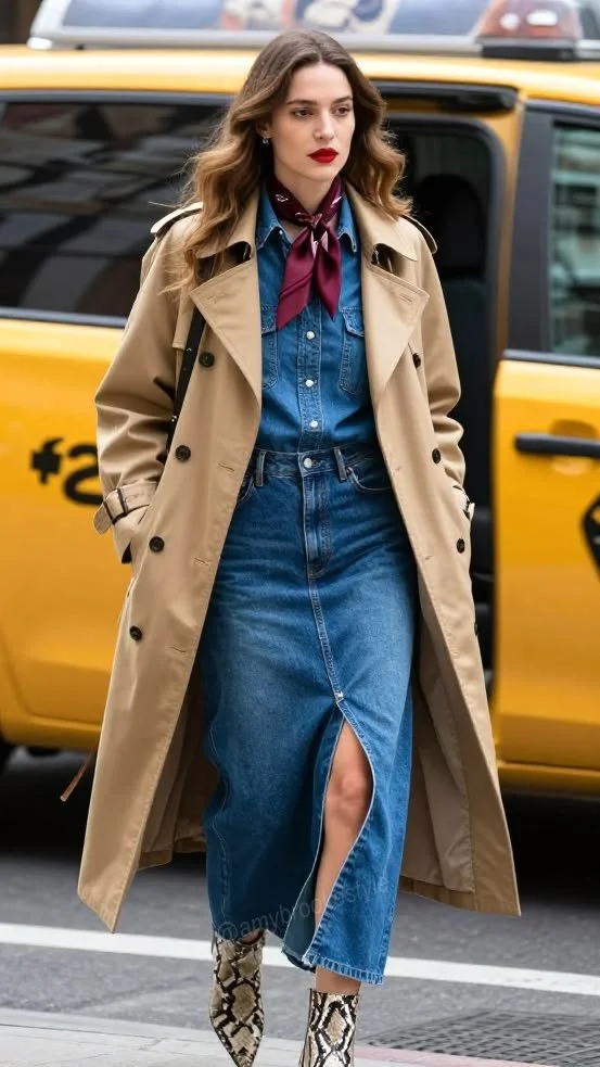 All-denim outfit with a print shoe and a trench coat.