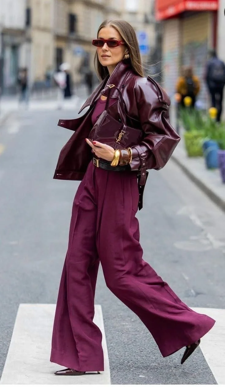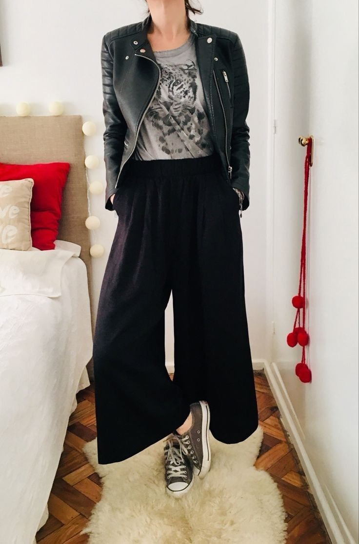 Pair a wide-leg pants with a graphic tee, faux leather jacket and fashion sneakers.