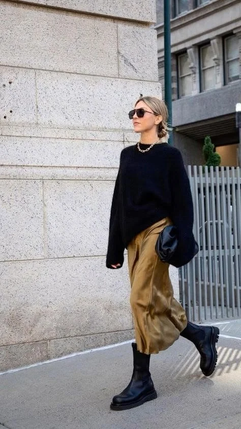Pair a lighter sweater with a silky skirt and boots.