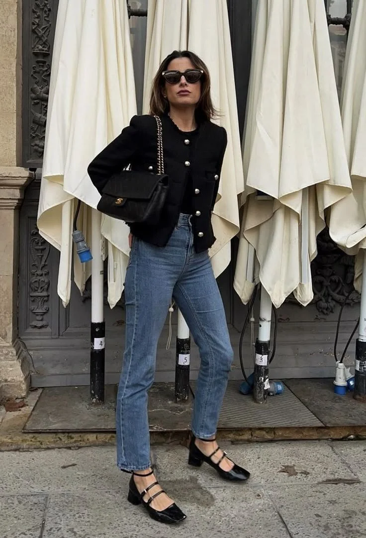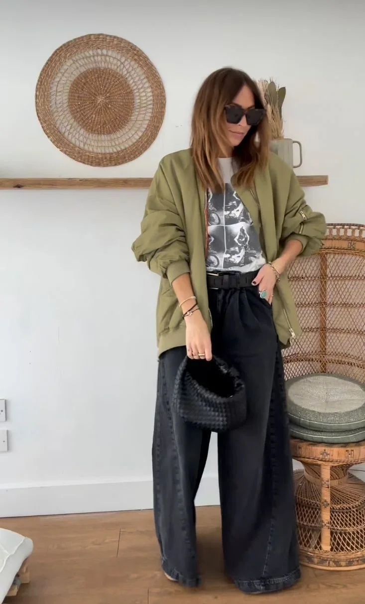 Washed black barrel jeans + graphic tee + bomber jacket + black boots or fashion sneakers.